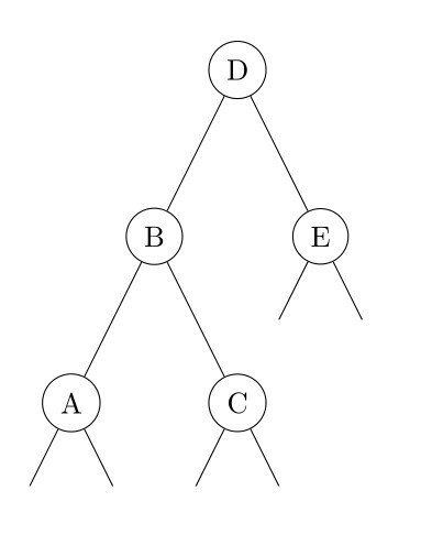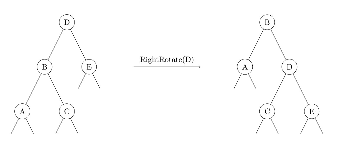 其中 是由于节点 B 满足性质 2,因此 和 的差不会超过 1。此时我们对节点 D 进行一次右旋操作(旋转操作与其它类型的平衡二叉搜索树相同),如下图所示。