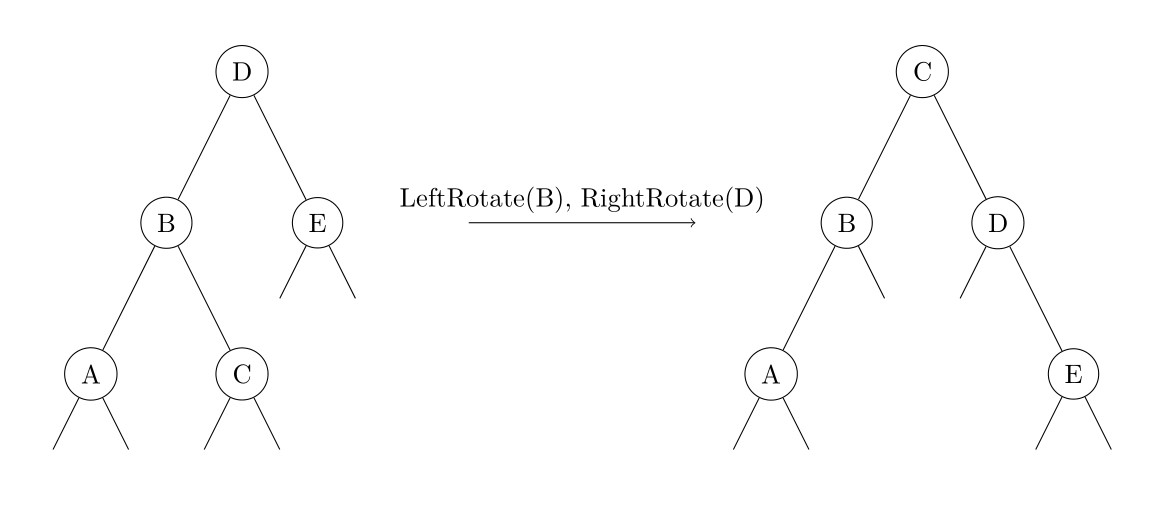 此时我们先对节点 B 进行一次左旋操作,再对节点 D 进行一次右旋操作,如下图所示。