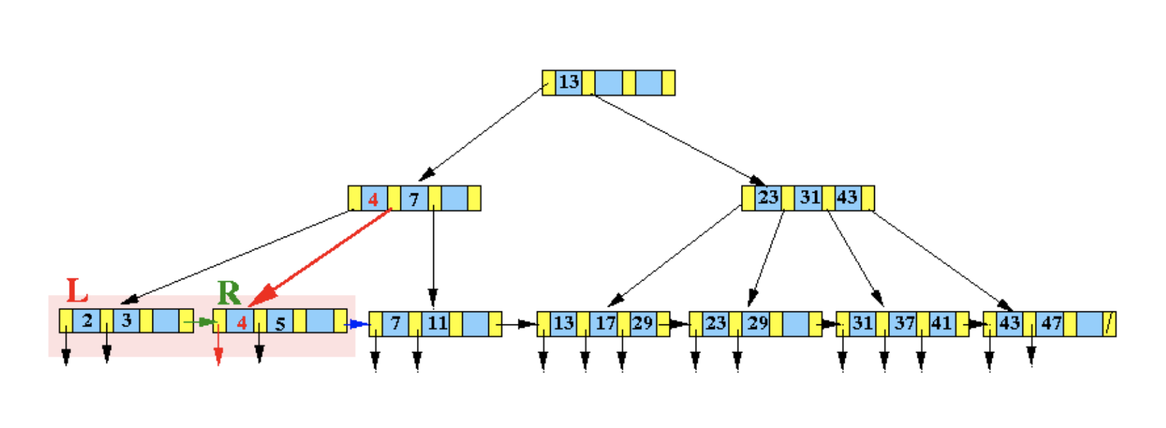 综上,需要在父节点中新增索引 4 和两个指向新节点的指针。