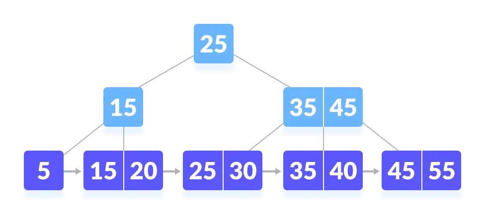 B+ 树只在叶子节点的层级上就可以实现整棵树的遍历。从根节点出发一路搜索到最左端的叶子节点之后即可根据指针遍历。