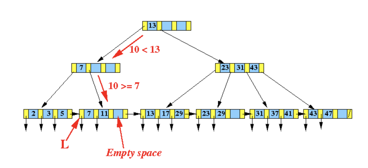 B+ 树的查找过程和 B 树类似。假设需要查找的键值是 ,那么从根节点开始,从上到下递归地遍历树。在每一层上,搜索的范围被减小到包含搜索值的子树中。