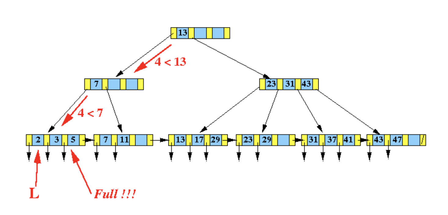 - 针对叶子类型节点:根据关键字找到叶子节点,向这个叶子节点插入记录。插入后,若当前节点关键字的个数小于 ,则插入结束。否则将这个叶子节点分裂成左右两个叶子节点,左叶子节点包含前 个记录,右节点包含剩下的记录,将第 个记录的关键字进位到父节点中(父节点一定是索引类型节点),进位到父节点的关键字左孩子指针向左节点,右孩子指针向右节点。将当前节点的指针指向父节点,然后执行第 3 步。