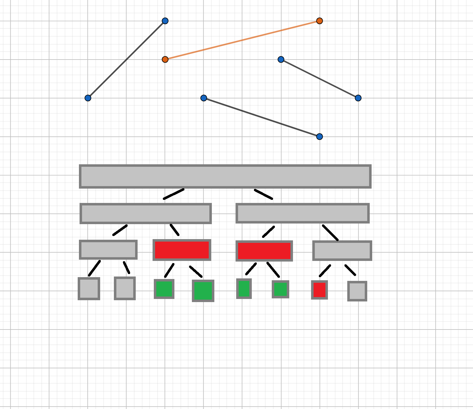 如图,按新线段 取值是否大于原标记 ,我们可以把当前区间分为两个子区间。其中 肯定有一个子区间被左区间或右区间完全包含,也就是说,在两条线段中,肯定有一条线段,只可能成为左区间的答案,或者只可能成为右区间的答案。我们用这条线段递归更新对应子树,用另一条线段作为懒标记更新整个区间,这就保证了递归下传的复杂度。当一条线段只可能成为左或右区间的答案时,才会被下传,所以不用担心漏掉某些线段。